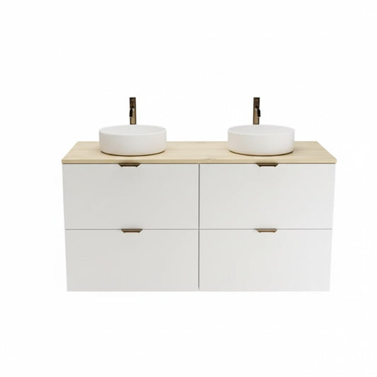 Badmöbel-Set: 120 cm Waschtischunterschrank mit 4 Schubladen und 2 Waschbecken Orio - Weiß/Eiche Artisan