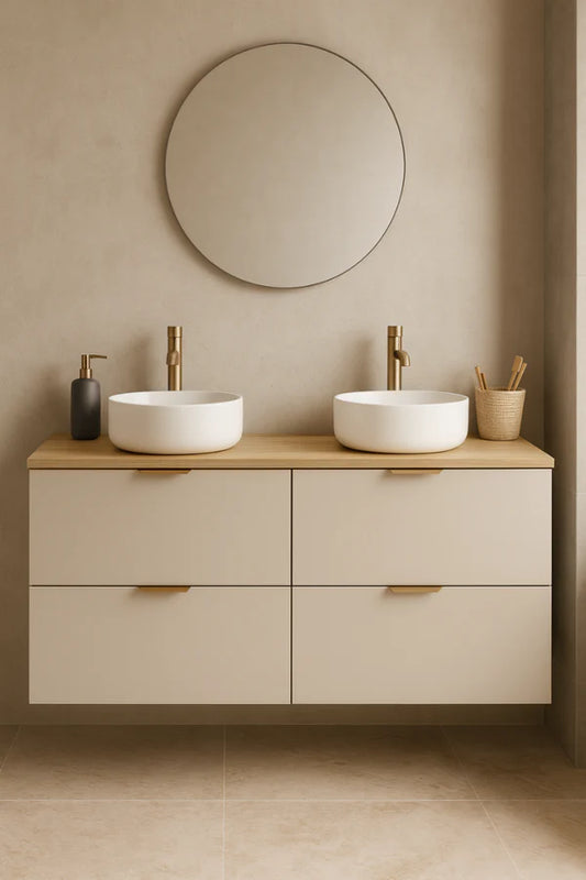Badmöbel-Set: 120 cm Waschtischunterschrank mit 4 Schubladen und 2 Waschbecken Orio - Kaschmir/Eiche Artisan