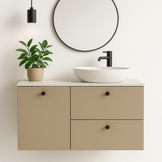 Die Beti-Badezimmermöbel in der Farbe Cappuccino vereinen zeitloses Design mit hoher Funktionalität und sorgen für eine warme, einladende Atmosphäre in Ihrem Badezimmer. Die Möbel zeichnen sich durch schlichte, glatte Fronten und elegante metallene Knopfgriffe aus, die zusammen ein modernes und edles Erscheinungsbild kreieren. Das praktische SOFT-CLOSE-System sorgt dafür, dass die Schubladen sanft und geräuschlos schließen, was den Nutzungskomfort deutlich erhöht.