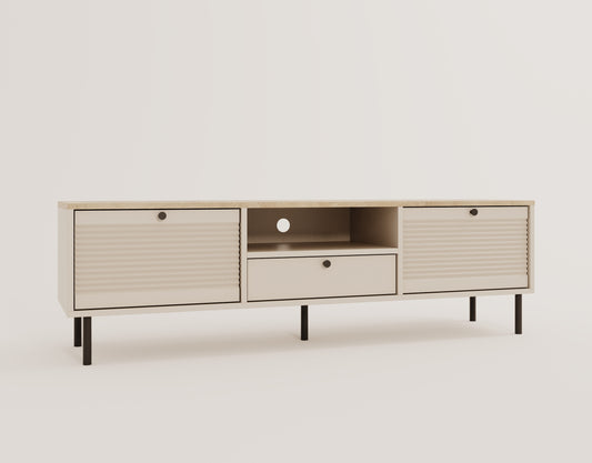 Besondere Akzente setzen die schwarzen Metallgriffe und filigranen Metallfüße, die dem Design Leichtigkeit und einen modernen Touch verleihen. Die Fronten begeistern durch einen spannenden Mix aus horizontalen Riffelungen und glatten Flächen – ein stilvoller Kontrast, der ins Auge fällt.