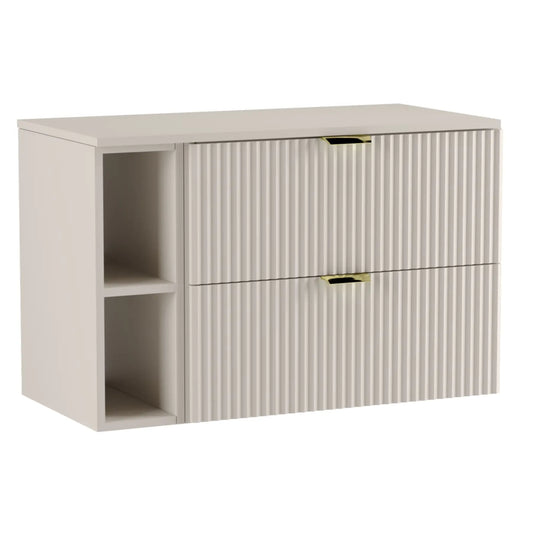 Die Badezimmermöbelkollektion Willy ist die ideale Wahl für alle, die moderne Eleganz in einer warmen, subtilen Kaschmir-Farbpalette schätzen. Ein charakteristisches Merkmal dieser Kollektion sind die geriffelten Fronten, die dem Raum Tiefe und Stil verleihen und das Badezimmer mit einem einzigartigen Charakter versehen. Diese Fronten, kombiniert mit zarten Metallgriffen, schaffen eine ästhetische Komposition, die sich perfekt in verschiedene Stilrichtungen einfügt – von modernen bis hin zu klassischeren Arrangements.