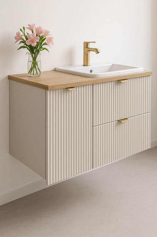 Die Badezimmermöbelkollektion Willy ist die ideale Wahl für alle, die moderne Eleganz in einer warmen, subtilen Kaschmir-Farbpalette schätzen. Ein charakteristisches Merkmal dieser Kollektion sind die geriffelten Fronten, die dem Raum Tiefe und Stil verleihen und das Badezimmer mit einem einzigartigen Charakter versehen. Diese Fronten, kombiniert mit zarten Metallgriffen, schaffen eine ästhetische Komposition, die sich perfekt in verschiedene Stilrichtungen einfügt – von modernen bis hin zu klassischeren Arrangements.
