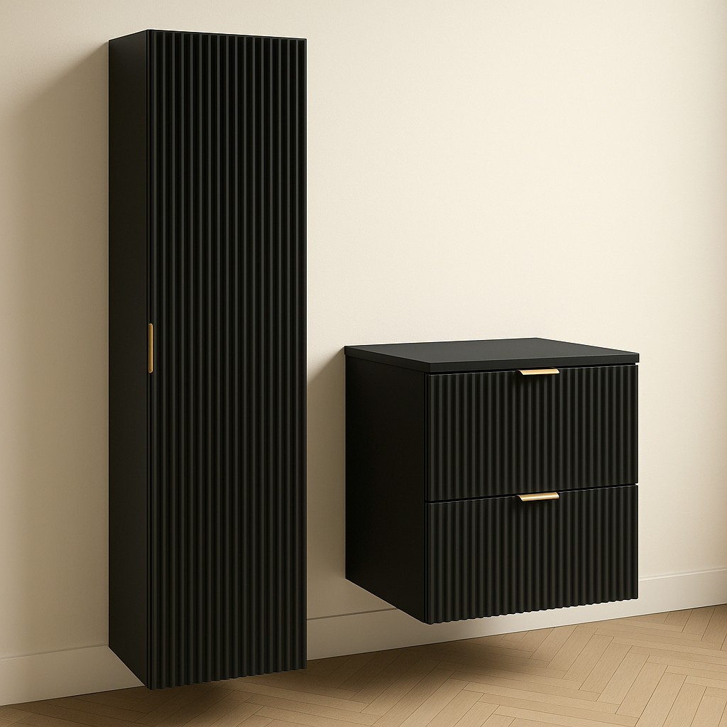 Entscheiden Sie sich für ein Möbelstück, das modernes Design mit klassischer Eleganz verbindet – den Bad Hochschrank 120 cm Willy - Schwarz. Die schwarze Farbe, ein Symbol zeitloser Ästhetik, fügt sich perfekt in jedes Badezimmer ein und verleiht ihm eine luxuriöse Note. Die geriffelten Fronten sorgen für einen besonderen Charme und spielen mit Licht und Schatten, um das edle Erscheinungsbild zusätzlich zu betonen.