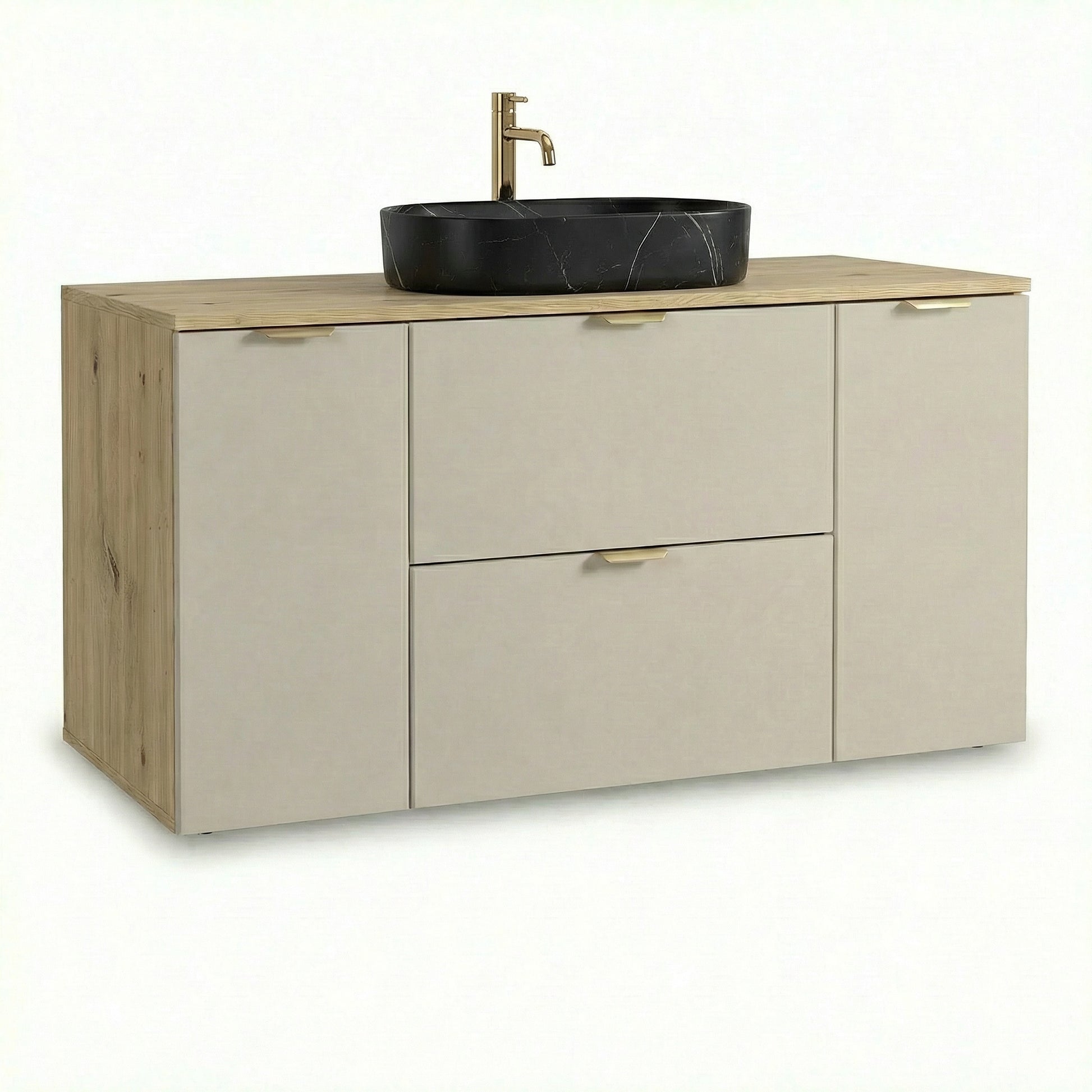 Badmöbel-Set Orio – 120 cm Schrank mit 2 Schubladen, 2 Türen in Kaschmir mit Eiche Artisan Korpus