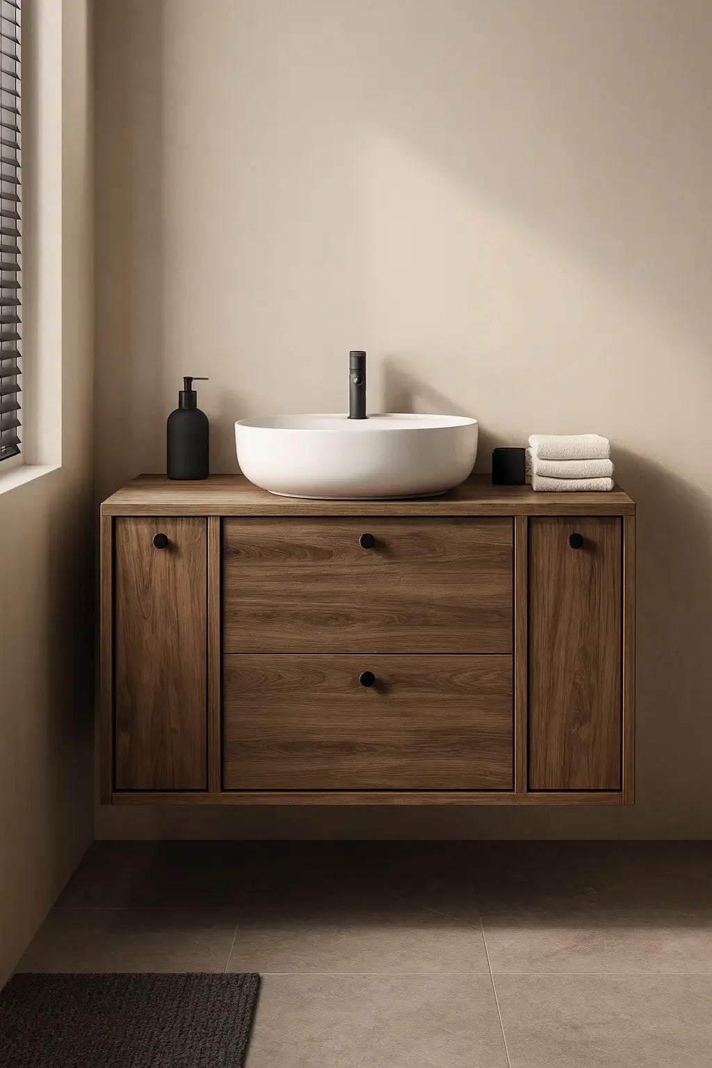 Dieser Waschtischunterschrank verbindet Funktionalität mit natürlicher Eleganz. Die dunkle Walnuss-Oberfläche schafft ein edles, gemütliches Ambiente, während SOFT-CLOSE-Schubladen und seitliche Regale optimalen Stauraum bieten.