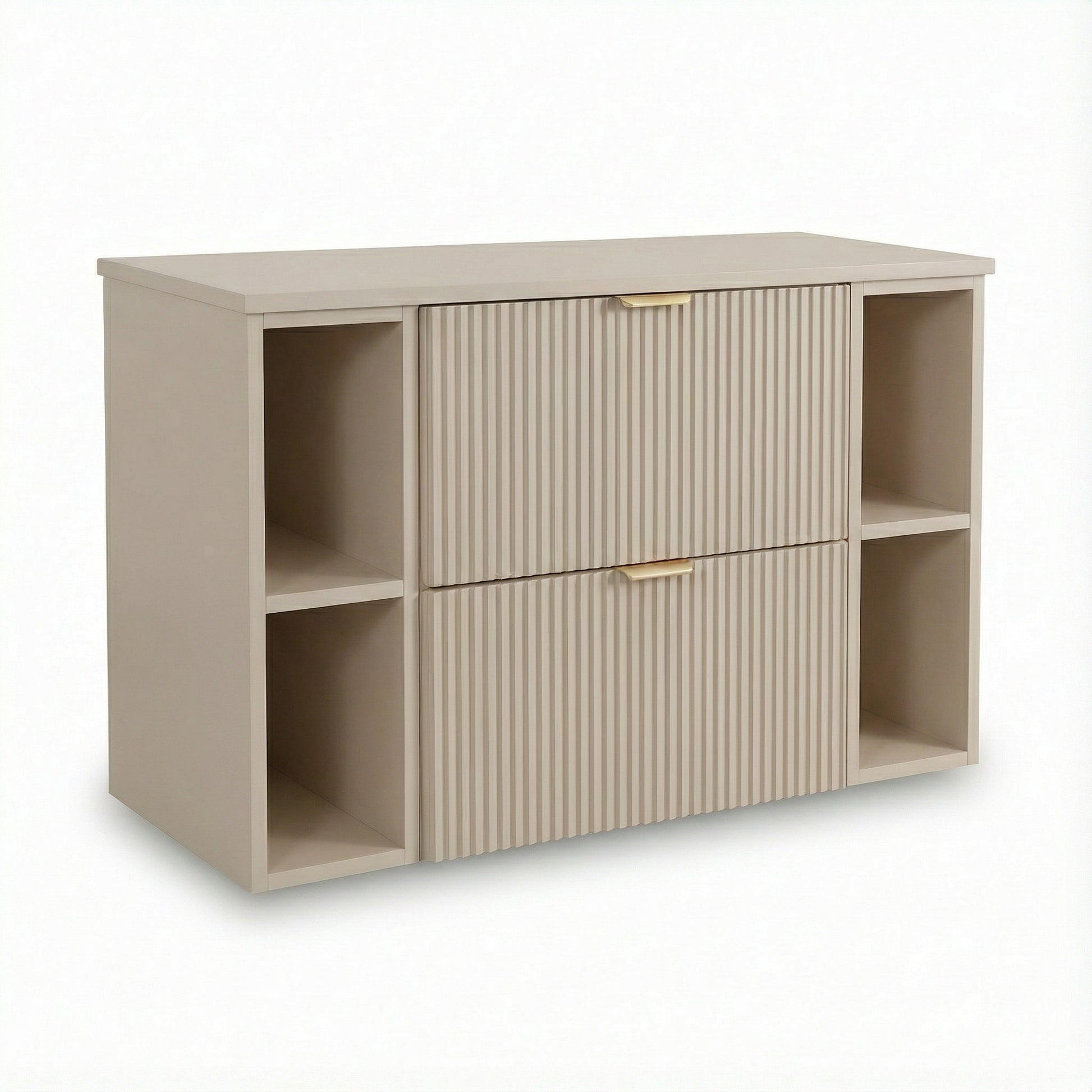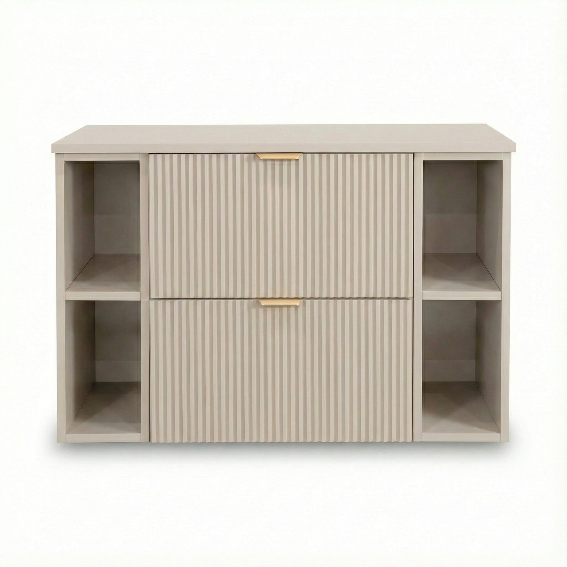 Die geriffelten Fronten verleihen dem Möbel eine moderne Struktur, während goldfarbene Metallgriffe edle Akzente setzen. Zwei geräumige Schubladen mit SOFT-CLOSE-System garantieren höchsten Komfort und leises Schließen.