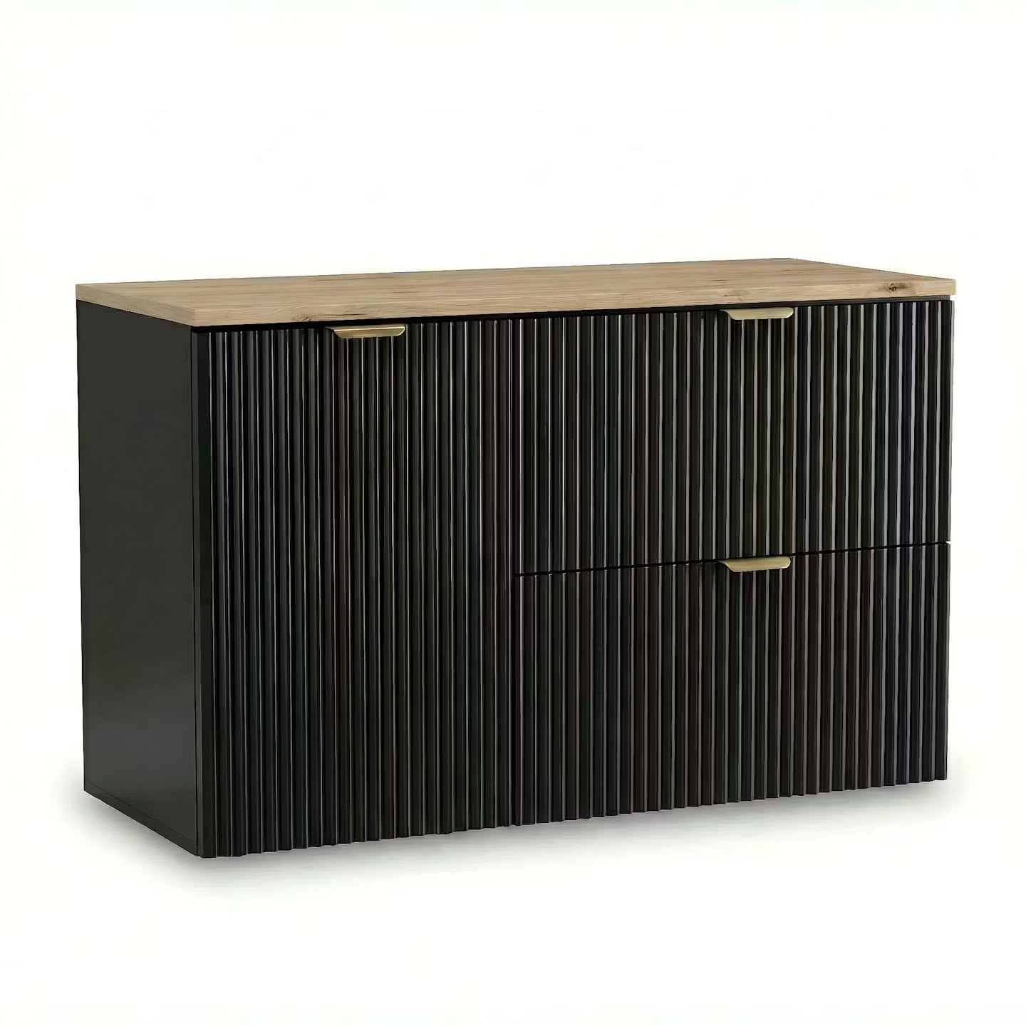 - Design: Schwarze geriffelte Fronten und goldene Metallgriffe – eine perfekte Kombination aus modernem und klassischem Stil