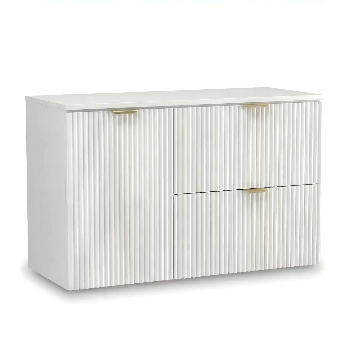 Erleben Sie die harmonische Verbindung von Funktionalität und modernem Design mit dem Waschtischunterschrank Willy 100 cm in alpeischer Weiß. Mit seinen geriffelte Fronten verleiht dieser hochwertige Schrank Ihrem Badezimmer eine zeitgemäße Note, während die goldenen Metallgriffe elegante Akzente setzen und den Gesamteindruck abrunden.