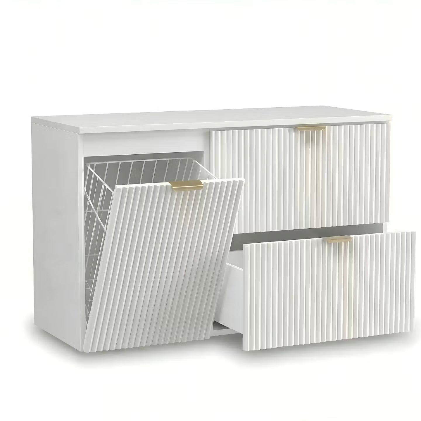 Das Besondere an diesem Schrank ist der integrierte Wäschekorb, der für Ordnung sorgt und es Ihnen ermöglicht, schmutzige Wäsche diskret zu verstauen. Mit einer Breite von 100 cm bietet er reichlich Stauraum, unterteilt in eine 60 cm breite Einheit mit zwei Schubladen und eine 40 cm breite Schrankeinheit.