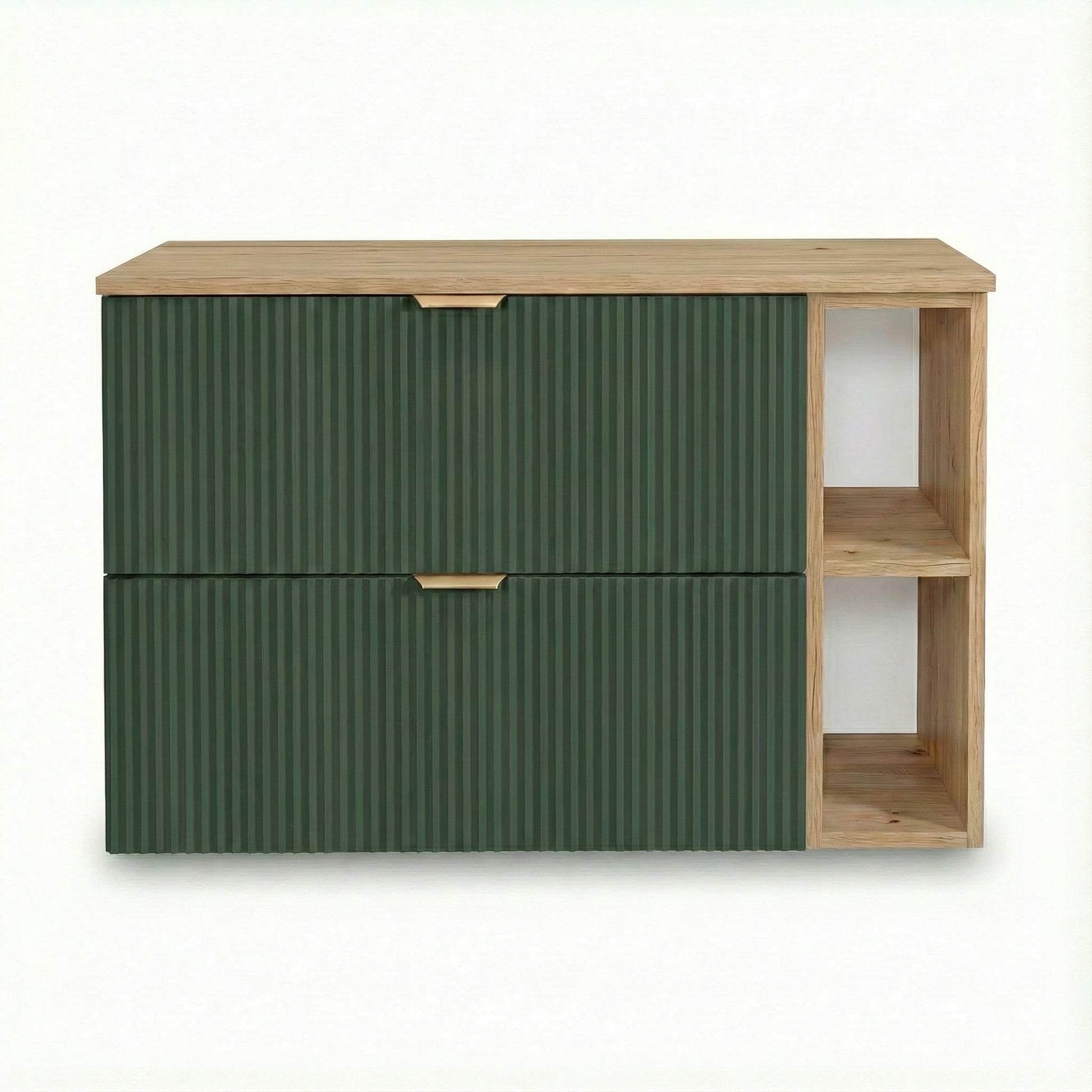 Waschtischunterschrank 100 cm Willy- Salbei, Walnuss Regal, Walnussplatte | Geriffelte Fronten und viel Stauraum für Badezimmeraccessoires