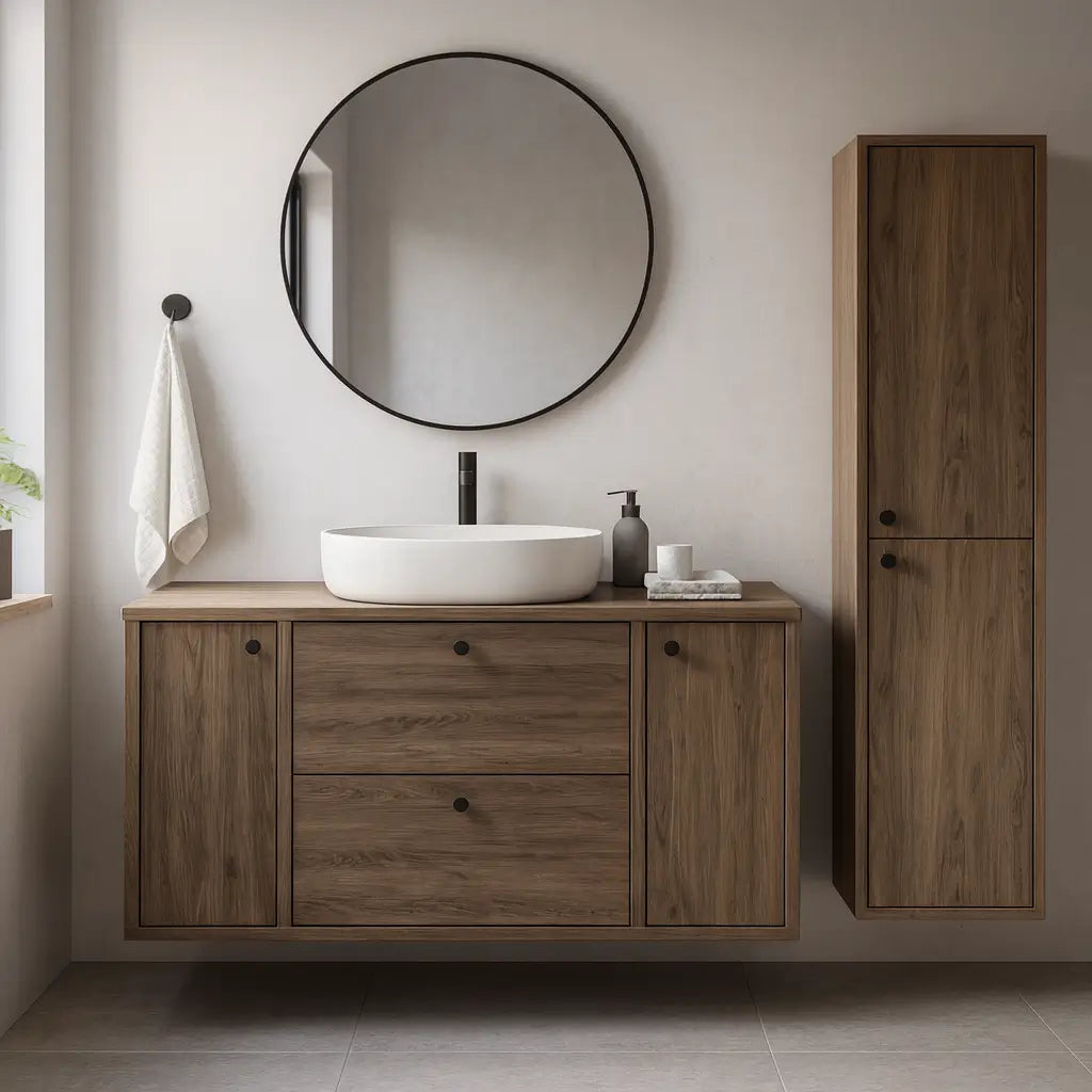 Der dunkle Walnusston sorgt für ein warmes, elegantes Ambiente und passt hervorragend zu modernen wie klassischen Badezimmerstilen. Das Stauraumkonzept ist auf Alltag und Komfort abgestimmt.