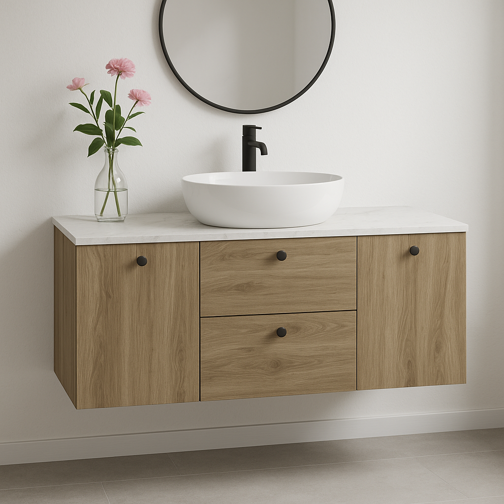 Das Set besteht aus einer 60 cm breiten Schrankeinheit und zwei 40 cm breiten Schränken mit Wäschekörben. Der Korpus und die Fronten in Walnuss Dunkel verleihen dem Badezimmer eine warme, luxuriöse Optik, während die Waschbeckenplatte in Marmur Bianco mit ihrer marmorähnlichen Optik einen stilvollen Kontrast setzt. Gefertigt aus 18 mm starker Laminatplatte, bietet der Schrank hohe Qualität und einfache Pflege.
