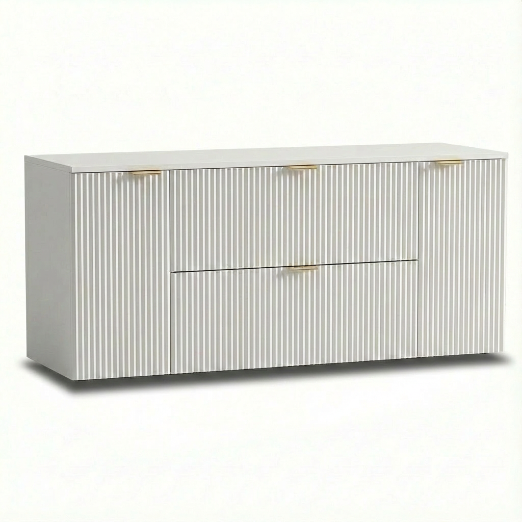 Waschtischunterschrank 140 cm mit Türen und Schubladen Willy – Weiß, geriffelte Fronten, goldene Metallgriffe