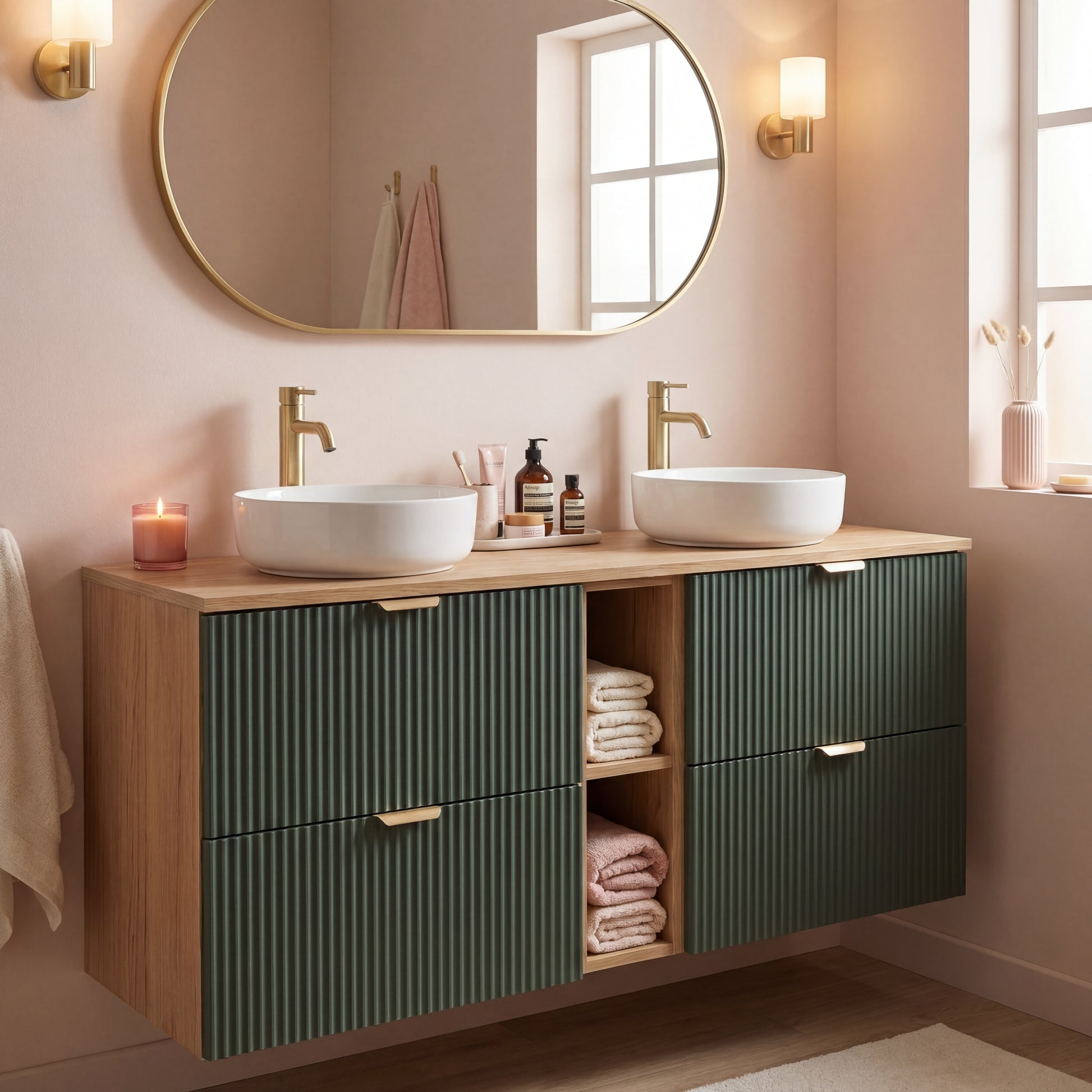 Der Waschtischunterschrank 140 cm Willy - Salbei/Walnuss kombiniert modernen Stil mit praktischer Funktionalität und ist die perfekte Wahl für jedes Badezimmer. Mit einer Breite von 140 cm bietet er großzügigen Stauraum für Ihre Badezimmerutensilien und sorgt für Ordnung. Die Farbgebung in Salbei und Walnuss verleiht dem Schrank eine beruhigende, natürliche Ausstrahlung und lässt sich hervorragend in verschiedene Badezimmerstile integrieren.