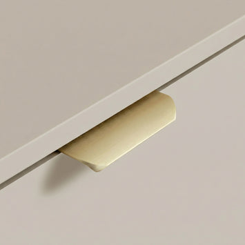 Ohne Oberteil geliefert, lässt sich der Waschtischunterschrank flexibel mit verschiedenen Waschbecken kombinieren. Die Griffe aus Metall sind standardmäßig in Gold gehalten, optional auch in Schwarz verfügbar.