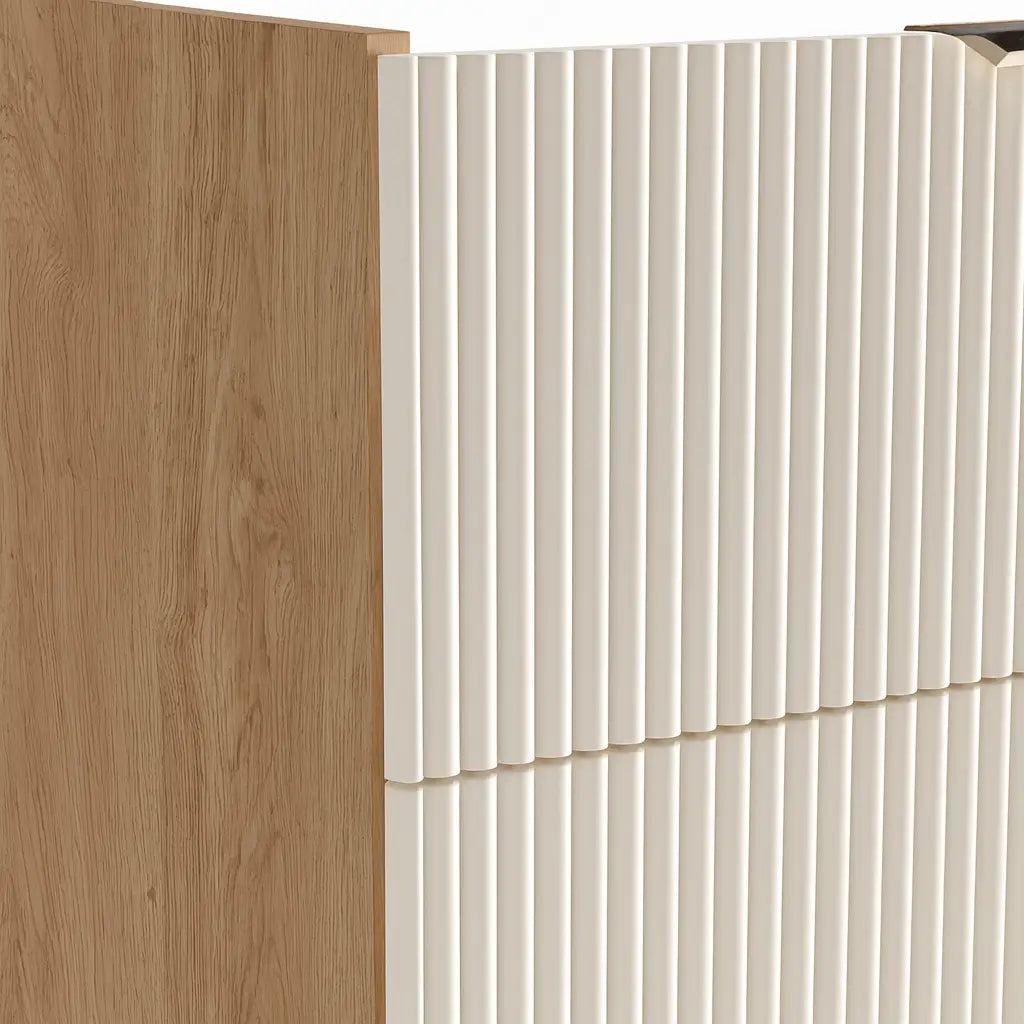Zwei großzügige Schubladen mit Soft-Close-System bieten komfortablen Stauraum für Badaccessoires, Handtücher und Kosmetik. Die vertikale Rillenstruktur verleiht dem Möbelstück eine hochwertige, trendige Optik. Wählen Sie zwischen Metallgriffen in Gold oder Schwarz, um das Design individuell zu gestalten.